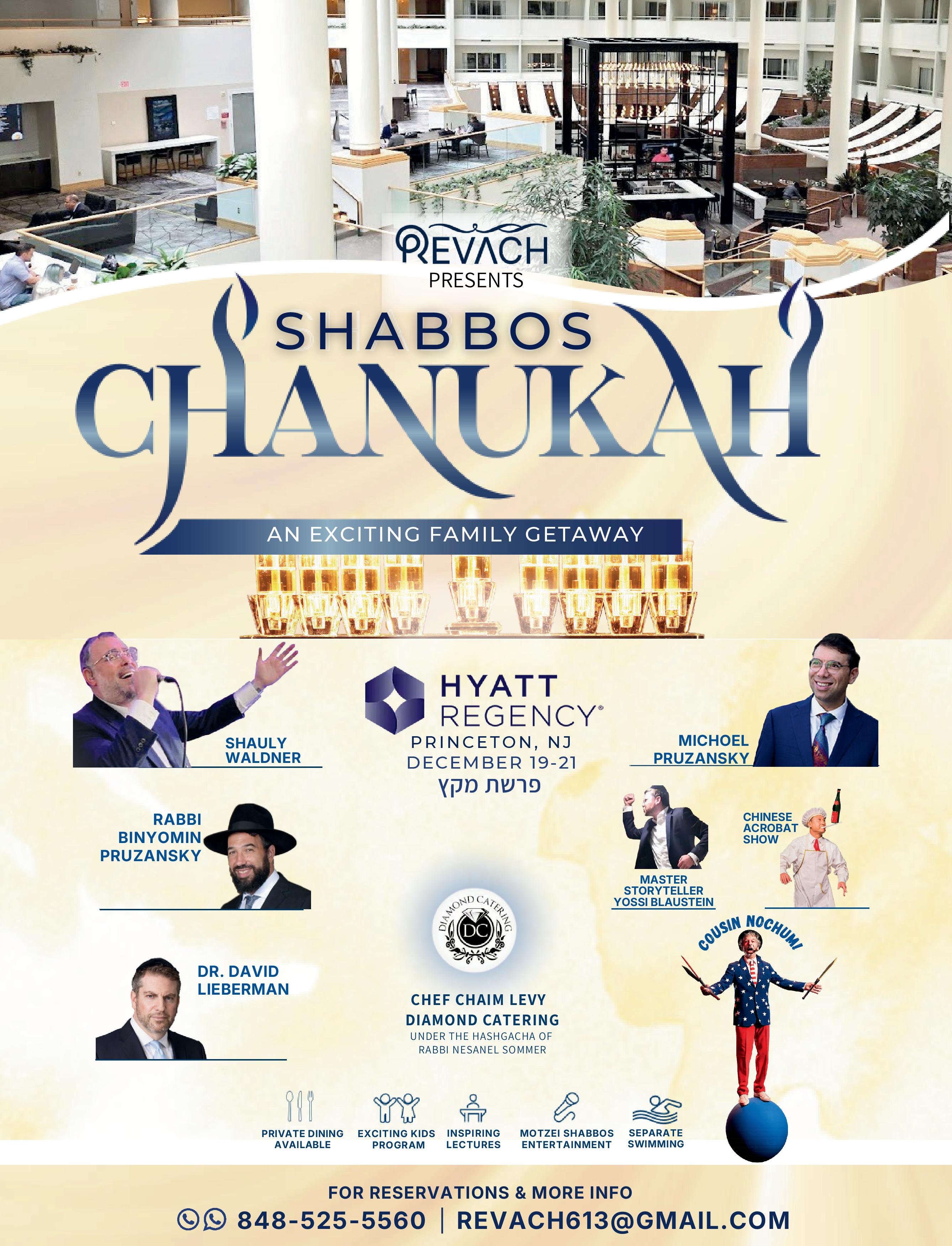 Looking for a memorable way to spend Shabbos Chanukah with your family this year? Revach offers an extraordinary Chanukah Program at the prestigious Hyatt Regency Princeton N.J. from December 19-21, Parshas Mikeitz.