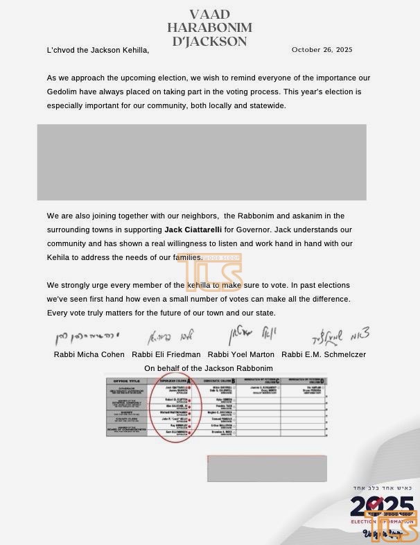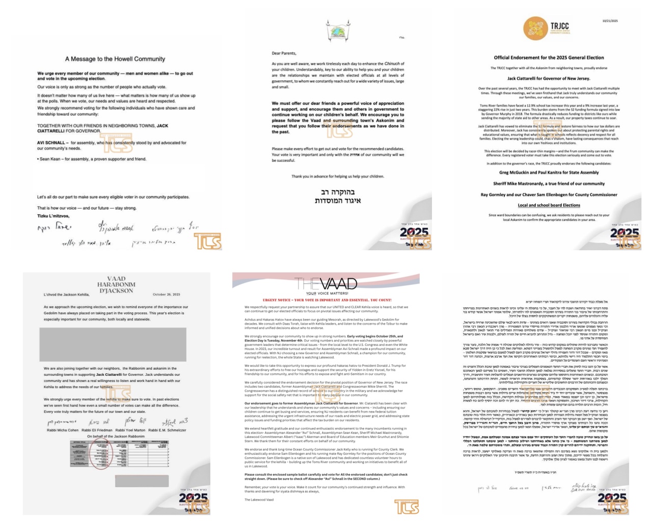 TLS first reported last week that the Vaad – the oldest political council in the area – would be endorsing Ciattarelli.