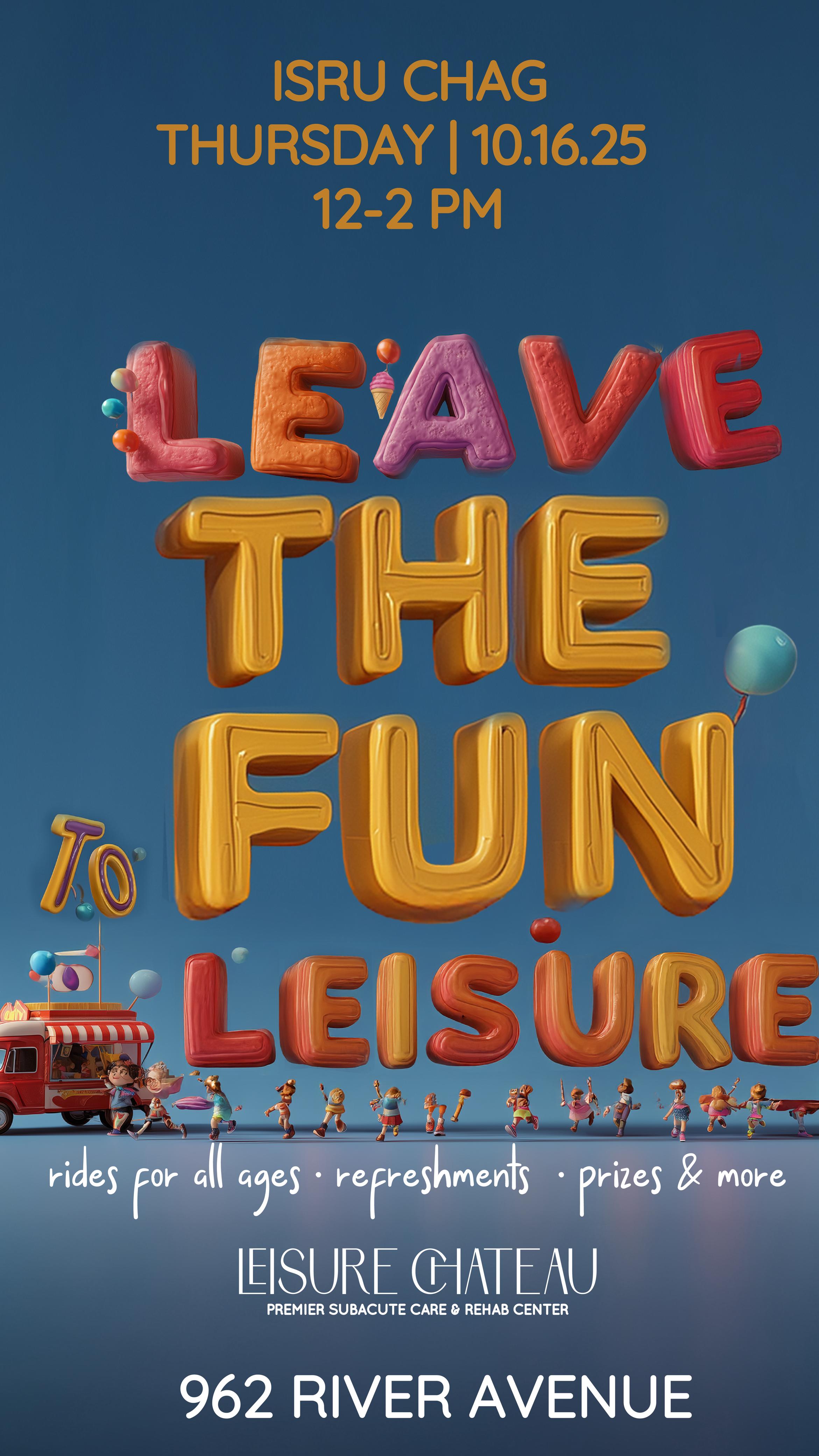 On Thursday, October 16th, from 12-2 PM, Leisure Chateau will host an ISRU CHAG celebration designed to bring joy and connection to the community.
